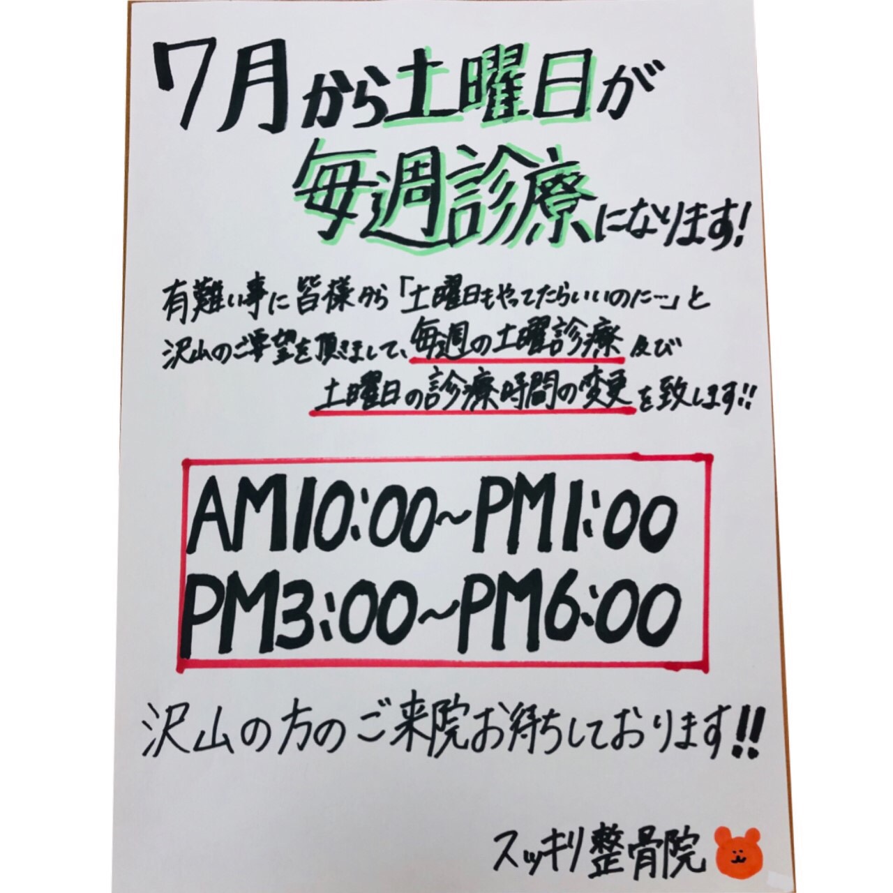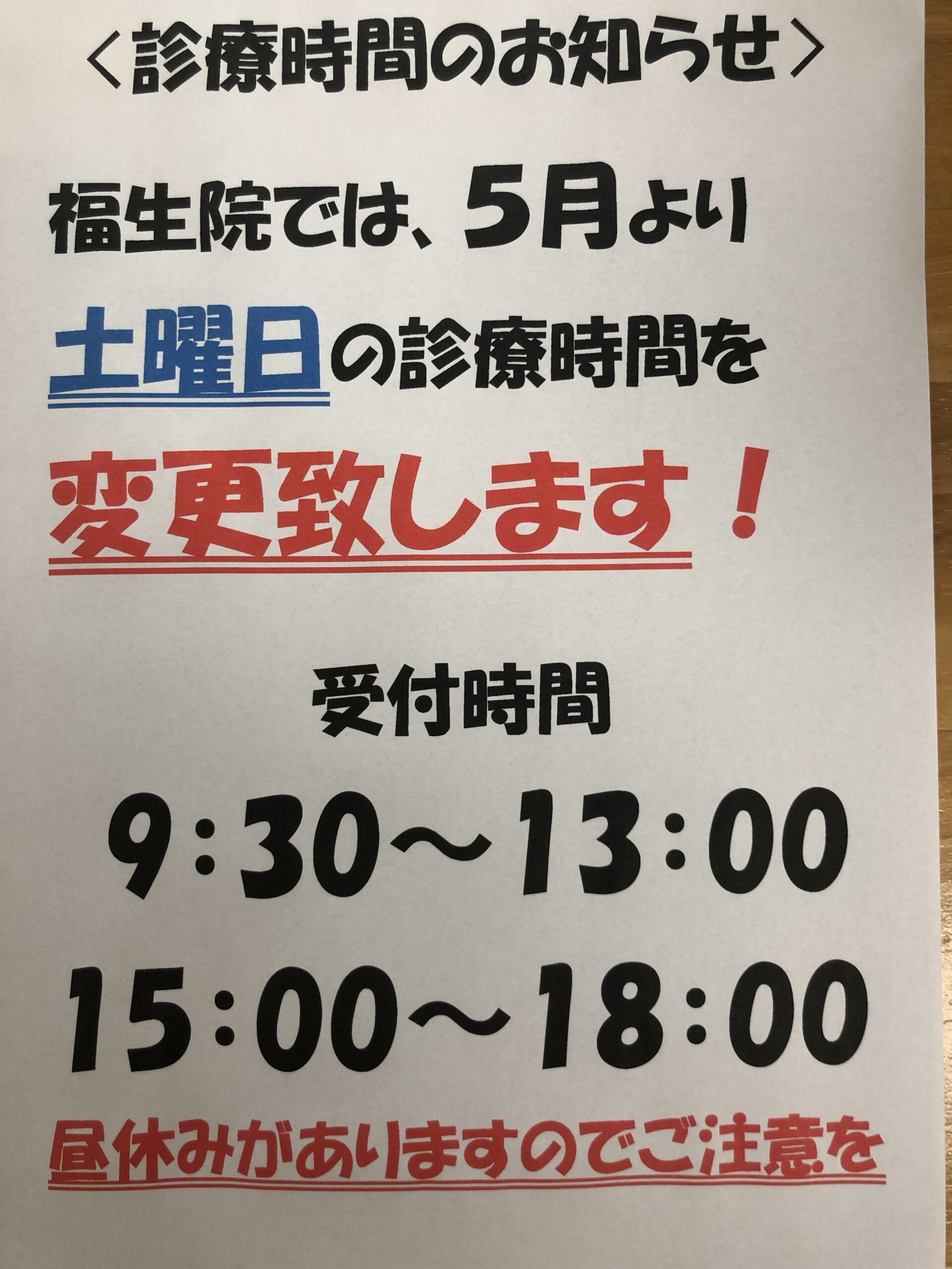 営業時間のお知らせ 福生院より 2021.05.06福生からのお知らせ Post Share Hatena Line RSS feedly Pin it note 記事のタイトルとURLをコピーする福生院では、5月より土曜日診療の時間が変更されます昼休みが入りますが、夕方18時までの受付となります!第一、三土曜日は変わらず休診ですがご利用しやすさは増しますので、是非ご利用くださいませ😊 これからの時期の紫外線😵前の記事 中高生、社会人のバスケットシューズの選び方次の記事